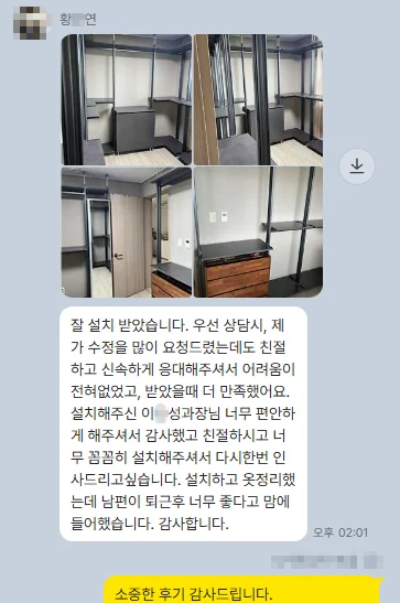 "설치하고 옷 정리했는데 남편이 퇴근 후 너무 좋다고 마음에 들어했습니다."